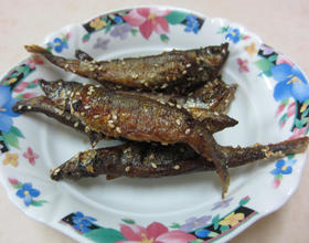 柳叶鱼超难侍候的用煎的很容易扒锅,肚子大大的一不小心就蹦开,我们可以先洗干净后用纸巾稍擦拭,再抓一点干面粉,入锅炸至焦焦的,捞出来沥油,这样就很容易定型