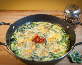 于作法3加入蛋、起司片,倒入黑鼎小炖锅,撒上起司丝。