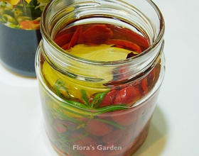 将番茄干放进干净的玻璃瓶、倒入橄榄油--必须淹过番茄。