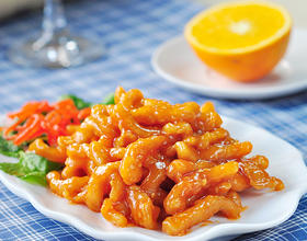 后话: 1,冻后的里脊肉比较好切成均匀的丝。 2,拌淀粉那一步骤,一定要耐心一点,慢慢撒。这样才不浪费淀粉,也能得到松散的里脊丝。 3,炸里脊丝要使用二次复炸法,就是第一次大火炸微黄,捞出来,烧油到冒烟后迅速倒进去,迅速捞出来。