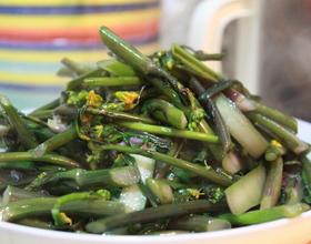 好漂亮的紫色菜心,都有点舍不得吃了,洗净,切段,如果比较大的部分就一分为二,不用太整齐也OK的。