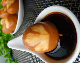 取一片芹菜叶贴在剥壳的鸡蛋上面