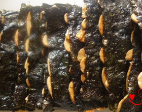 将沾蛋液的杏仁铺在海苔上