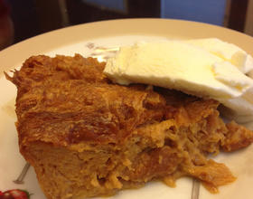 - 6. 把焦糖蛋汁倒入可颂锅里,尽量往下压,让可颂完全浸在汁液里
