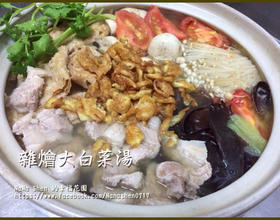 - 3. 汤锅底部先放入大白菜和高汤块后加水焖软,续加入肉片、木耳、虾米、金针菇、洋菇、番茄、豆腐皮、和作法分2)之蛋酥,以及调味料慢炖即可。