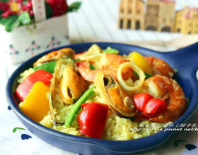 - 1. 起油锅,爆香蒜末及洋葱,接着放入海鲜拌炒至虾壳变红接着加入白酒煨煮一下