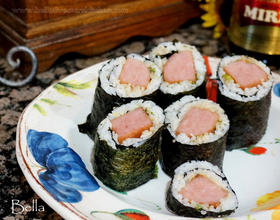 - 4. 夹两条午餐肉放在没空隙的那边,在白饭上面洒点海苔甘松,将寿司卷从午餐肉的那边轻轻卷起,卷起后轻轻用手将饭团捏紧