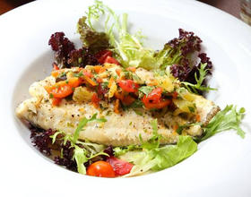 依个人喜好挑选生菜沙拉铺底,再将石斑鱼放上