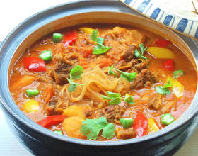 - 15. 将绿豆宽粉及彩色甜椒和秋葵加入锅里,稍加煮熟入味撒上香菜即可享用。