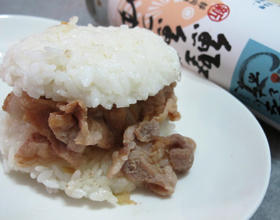 - 9. 放入一块米饼当底,放上姜汁猪肉,整型让他不要乱散