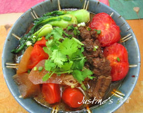 煮熟适量的面条放入深碗或深盘中、加入适量的炖牛肉原汁、摆放萝卜块、番茄块、青江菜、牛肉块,再加适量的汤水(牛骨或猪骨或鸡汤或煮面水均可)