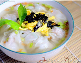 - 24. 加上蛋皮丝、海苔丝,撒上香油即成好吃的平民美食【鲜豚馄饨汤】近看,好好吃吧。
