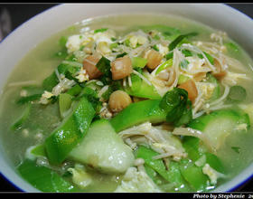 煮至丝瓜煨软时熄火~打开锅盖倒入蛋液~盖上锅盖闷至2~3分钟