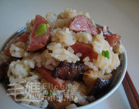 - 5. 后再加入腊肠, 香菇, 葱绿翻炒