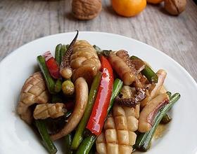 2,鱿鱼过开水焯烫,再放凉水,可以保证鱿鱼的脆嫩口感。