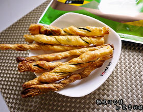 - 2. 起酥片涂上蛋液(亦可不涂)撒上起司粉与少许的盐