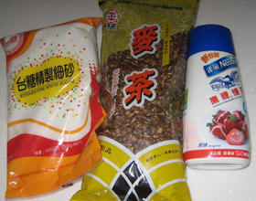 将煮好的麦茶过滤后加入细砂糖和鹰牌炼乳