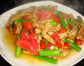 然后倒入已切好的配料(泡菜、泡豆角、泡辣椒、切好的大蒜片及氽过水的蒜苔),再翻炒四五下准备起锅。