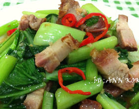 青菜切断洗净沥干水分,烧肉切块,蒜蓉和红辣椒切丝待用。
