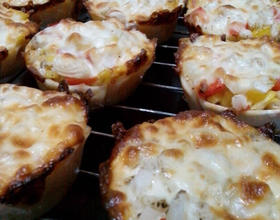 将水饺皮放进玛芬烤盘内,用叉子插洞,再涂上一层番茄酱..