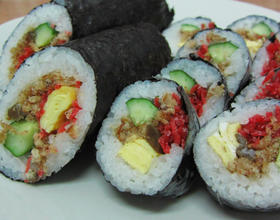 取一张海苔放在竹帘上,将醋饭铺于海苔之上再放上包馅卷紧切块即可摆盘。