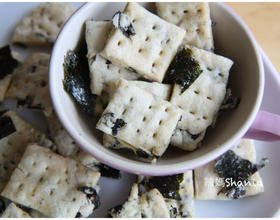 等饼干凉了, 会在洒上一点盐巴与撕碎了的海苔, 稍微混合一下 会更有味道喔!