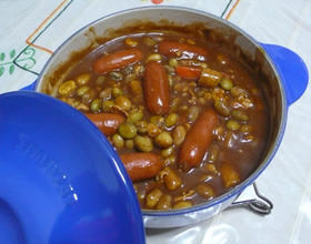 将豆子.红萝卜加水煮软续放玉米笋.咖哩块下去煮至溶化(小火不断搅拌免得沾锅)