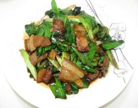 然后放入蒜苗翻炒片刻,加盐、味精调味。