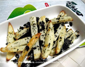 - 8. 薯条烤好后,稍微放凉回脆后,再倒进装着碎海苔的塑胶袋中,抓住束口,用力摇晃,混合均匀。