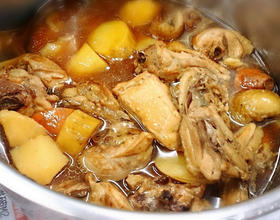锅子不用清洗直接将地瓜及腌鸡肉的酱汁用大火炒到酱汁附着到地瓜表面后,连同酱汁倒入炒好的鸡肉的深锅中。中间可以调整咸度。