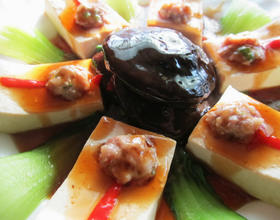 - 12. 捞起香菇后摆置盘中间,覆盖青江菜叶,然后将卤香菇剩馀汤汁,勾薄芡后淋少许香油浇至豆腐上。