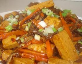 木耳发出爆响声时,放入豆腐条,翻炒。