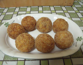 - 6. 油烧热至140度左右,转微火,放入薯球放入,约2分钟后再转至小火,炸至金黄即可。