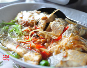 - 2. 将切块的先于铺在盘底,放上辣椒丝、嫩姜丝,再舀入豆鼓味噌,淋上米酒与酱油调味