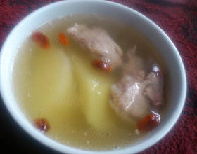 沸水 加入姜片.排骨.青木瓜逐一加入以大火煮沸加入香菇转中火继续煲煮至木瓜软嫩汤汁清澈再调味起锅前枸杞再撒入淋上香油~