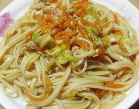 再倒入氽软的胡萝卜丝和西葫芦丝,一起煸炒一会