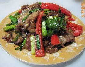青红椒和蒜叶下锅快速翻炒,调入少量盐和味精出锅。