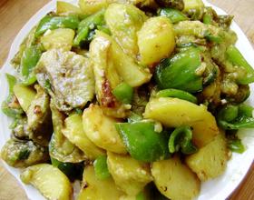 - 7. 热锅留少许底油,爆香葱姜末,放入青椒翻炒均匀,倒入土豆翻炒均匀。