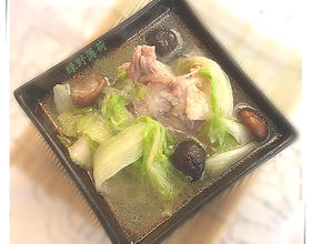 在大骨汤中,放入娃娃菜,粉丝,盐,煮开后即可。