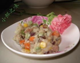 锅烧热倒少许油,分别下入洋葱、青豆、胡萝卜、玉米、培根。