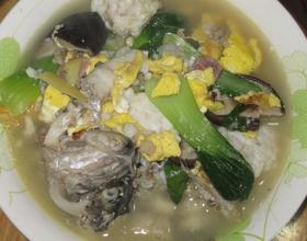 - 21. 在鱼汤煮了15分钟左右时放入小青菜和蛋皮。