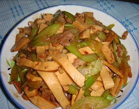 倒入香干和芹菜,加少许老抽,炒至上色均匀。