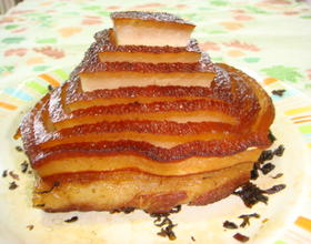 将蒸好的五花肉取出来,从顶上轻轻用尖头筷子挑起,让整块肉形成一个塔的形状。在做这个步骤时,比较费劲,因为技术不到家。不过,还是有点儿塔的形状。