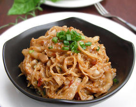 1:萝卜丝可一次做晒一些,方便随时食用。如果没有干萝卜丝,也可用新鲜萝卜丝代替,先把白萝卜刨成细丝,然后加盐腌制一下,等出水以后,用双手用力挤压掉水份即可。但口感略差些。