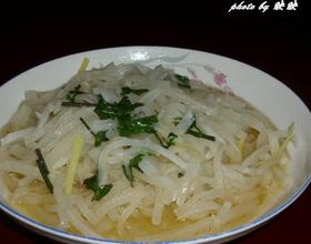 翻炒萝卜丝变软,加入1勺盐和一勺椒盐,翻炒均匀入味。