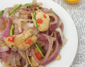- 6. 锅内倒油,把姜片和葱白爆香之后,再把腌制好的鸡肉片放入翻炒。