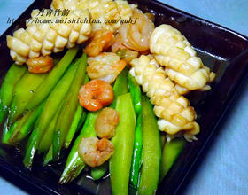 至芥蓝将熟下入鱿鱼花和虾仁,加盐、蒸鱼豉油调味出锅即可。