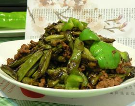 最后把青椒放入。由于四季豆已煸透无水分,炒锅内会显得较干,此时应迅速颠匀菜品,有轻微烟气冒出时即刻离火。