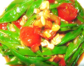 热锅,少油,四季豆下锅翻炒,然后加干贝一起翻炒。关小火,把小番茄对半切,加盐&鸡精,小葱,加点水,倒入炒锅里一起烩一烩。最后加芡粉收汁即可。