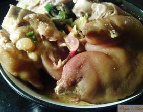 - 1. 猪蹄洗净,用水浸泡十五分钟左右。等到猪蹄中的血被泡出来后,把血水倒掉。